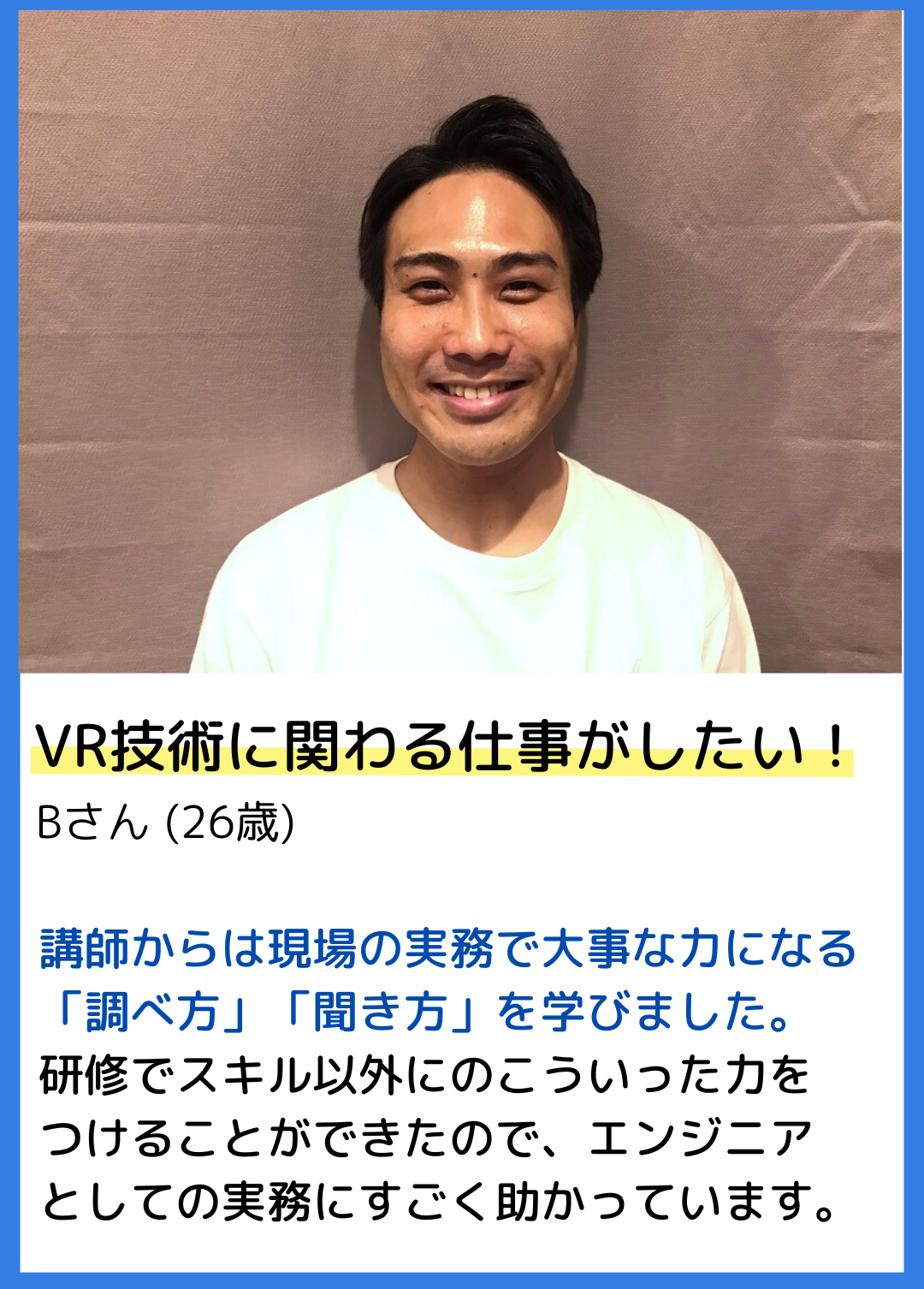 僕自身、「本当にエンジニアに向いているのかな」という状態で体験に行ったのですが、IT業界に詳しい方が対応してくれて、全ての質問に丁寧に答えてくださり、やってみよう!という気持ちになれました。
